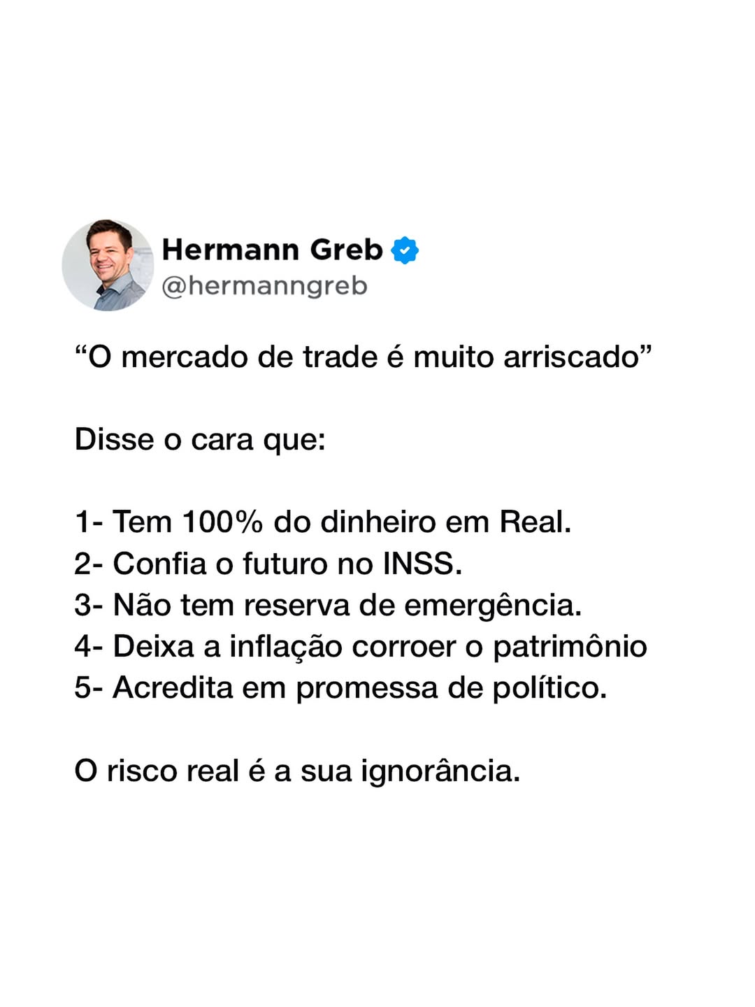 Hermann Greb é um ex-trader de bancos. Isso é extremamente importante pois um trader de mesa bancária opera em volume, com gestão de risco real e pressão institucional.